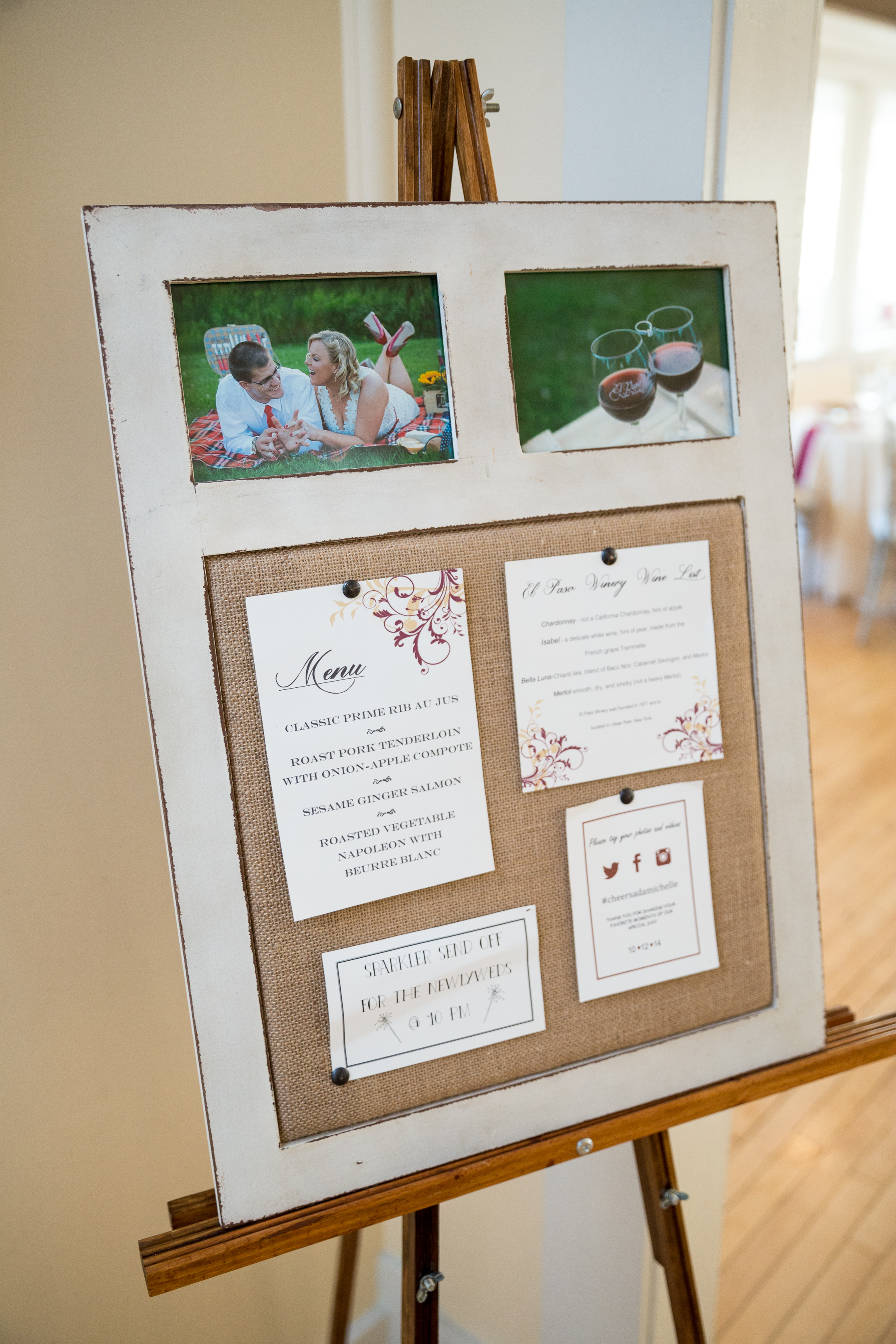 Once you were inside this incredibly rustic yet elegant reception site the couple had splashes of their theme everywhere. Â The escort card table; complete with their #hashtag; was lined with their cork handled cheese knife as well as their escort cards held in place by wine corks. Each table was decorated with hand embossed A&M wine crates and wine bottles from the couple.